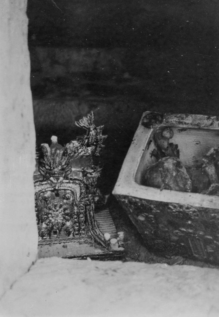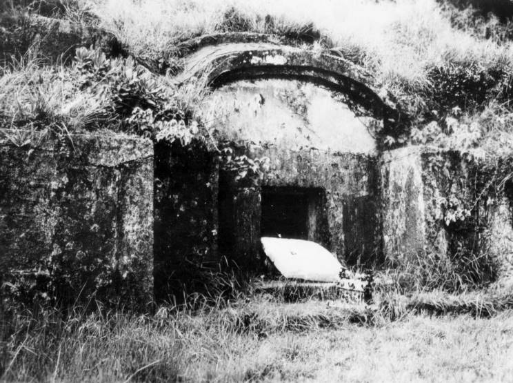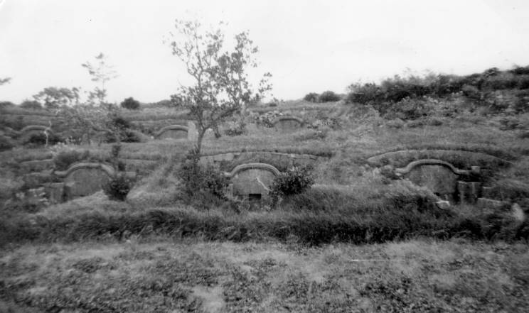 Okinawa burial tombs. Probably the greatest oddity to a G.I. new on the island. The natives believe in reincarnation, the dead being buried until decomposed and the remains placed in urns as shown in these pictures. |