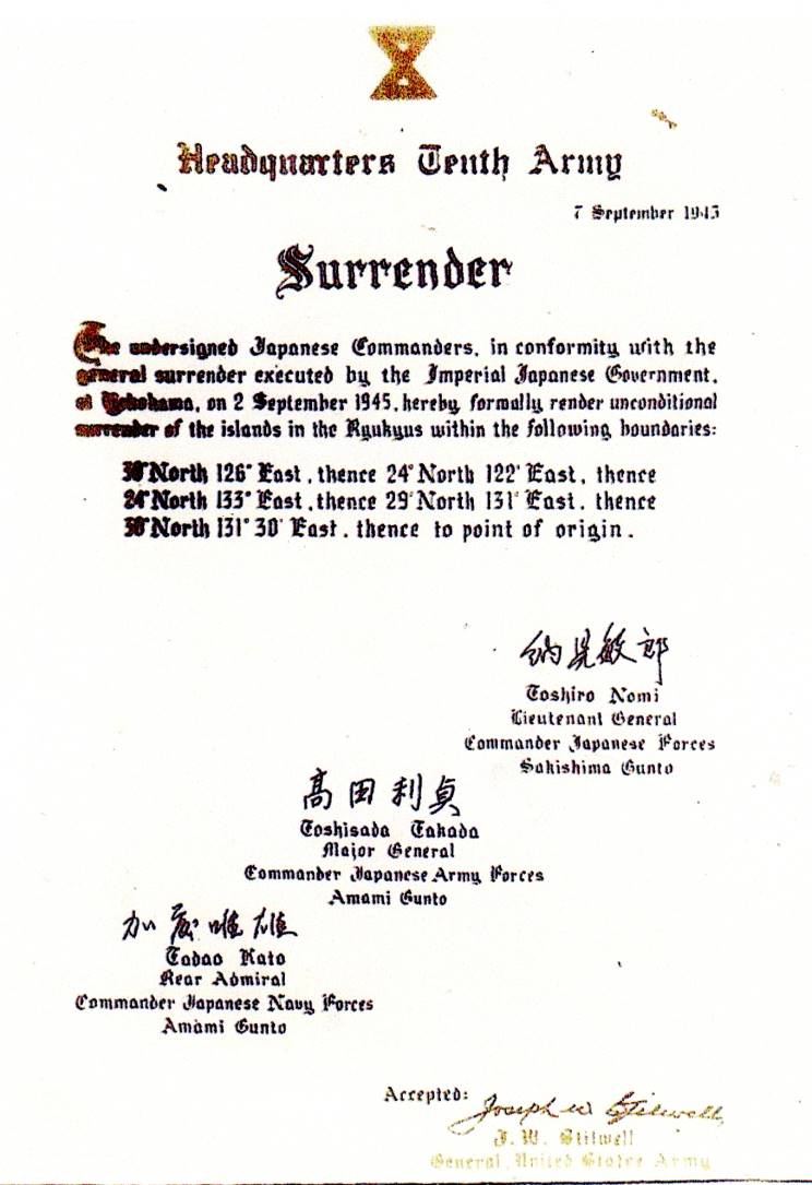 The instrument of surrender of the Ryukyu Islands signed on Sept. 7, 1945 on Okinawa. |