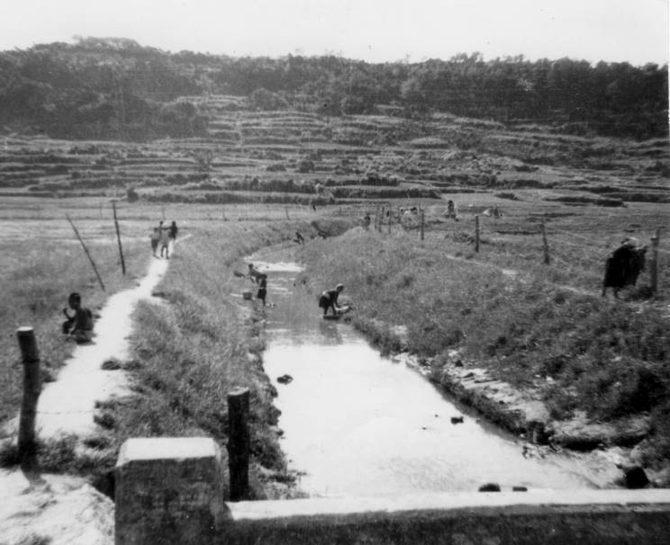 Natives laundering in a stream. A good example of terraced rice paddies seen in the background. |