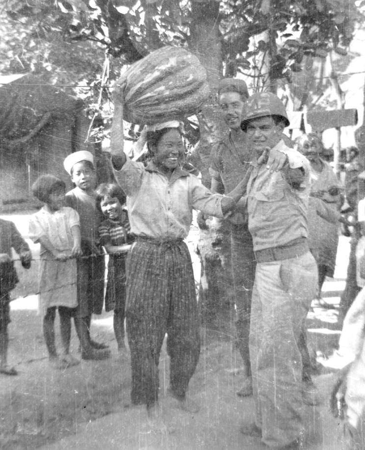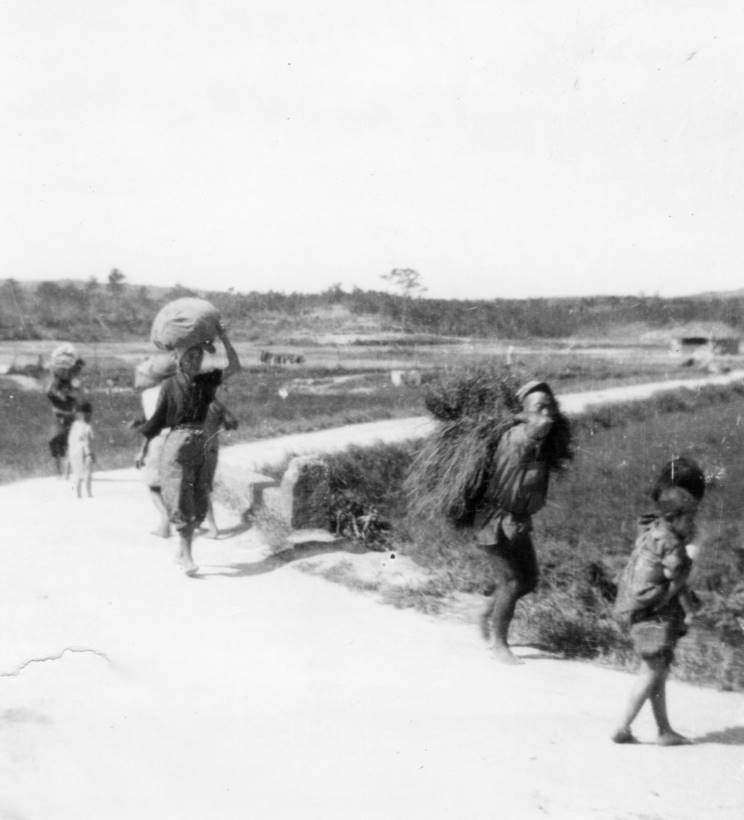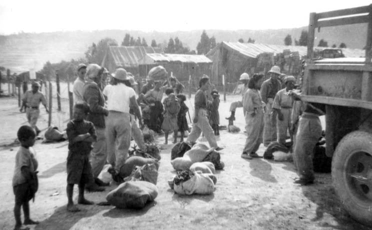 Working parties returning from working for the Americans; including the days salvage--or loot. |