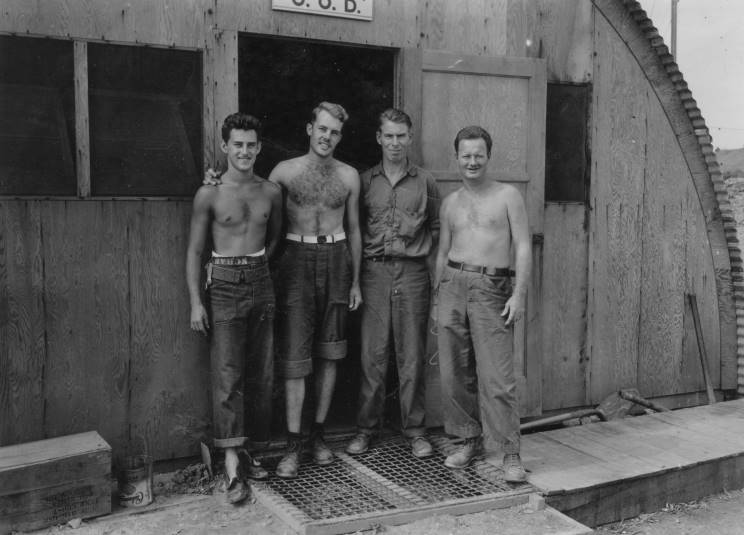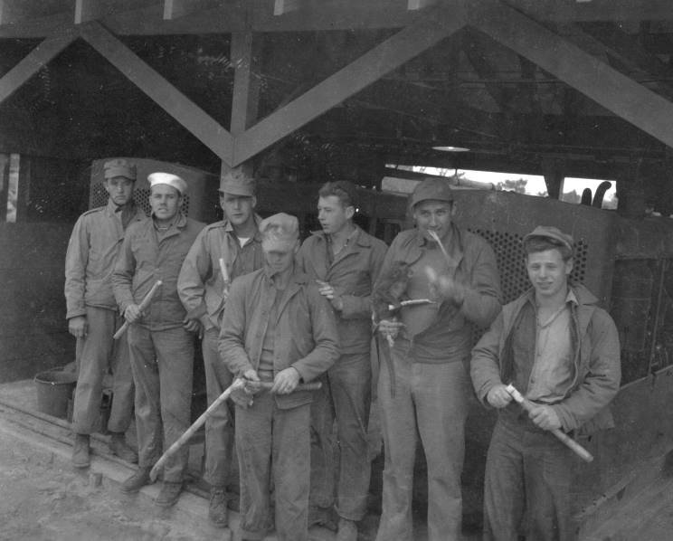 The electric crew in front of the generator building at water point. From left to right: Hammond, John Parmer, Emmerson, Hoot, Twitchell, Barrett and monkey, Buster. |