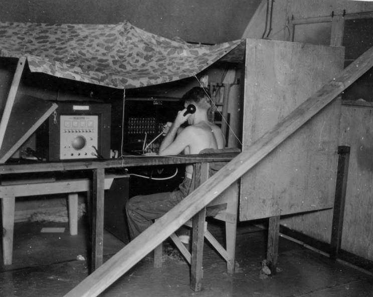 Sept. 16, 1945 John Parmer at the switchboard just before the typhoon. Notice the bracing, water and canvass over the switchboard. |
