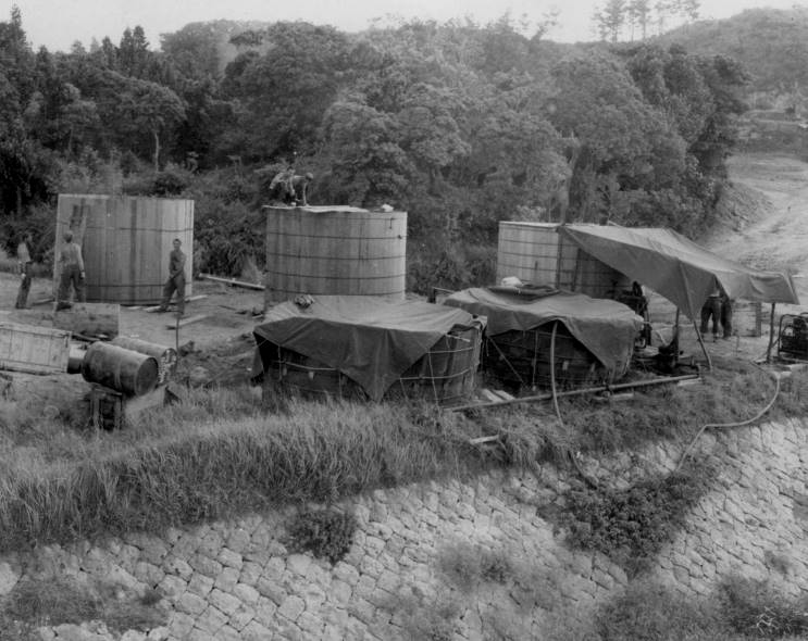 Setting up camp on Okinawa. At right is the water ration tank, we were allowed ¼ canteen per day. |