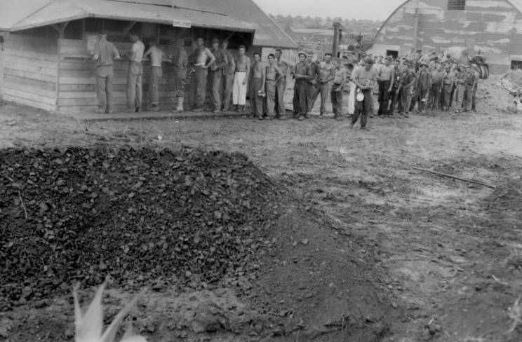Washing our mess kits before chow. Mess hall not built yet. |