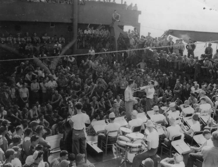 USS California BB-44 band entertaining the men on USS Rawlins APA-226 off the Caroline Islands. |
