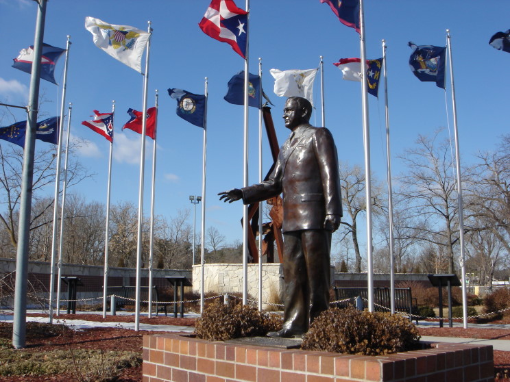 Statue of Andrew Jackson Higgins by Fred Hoppe. The Freedom Memorial is seen in the background.