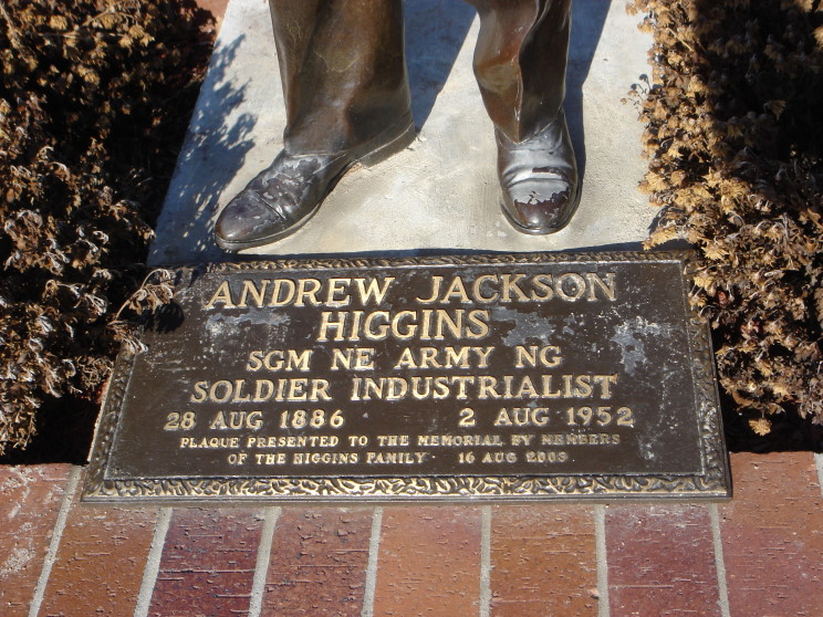 Plaque at the base of the Andrew Jackson Higgins statue.