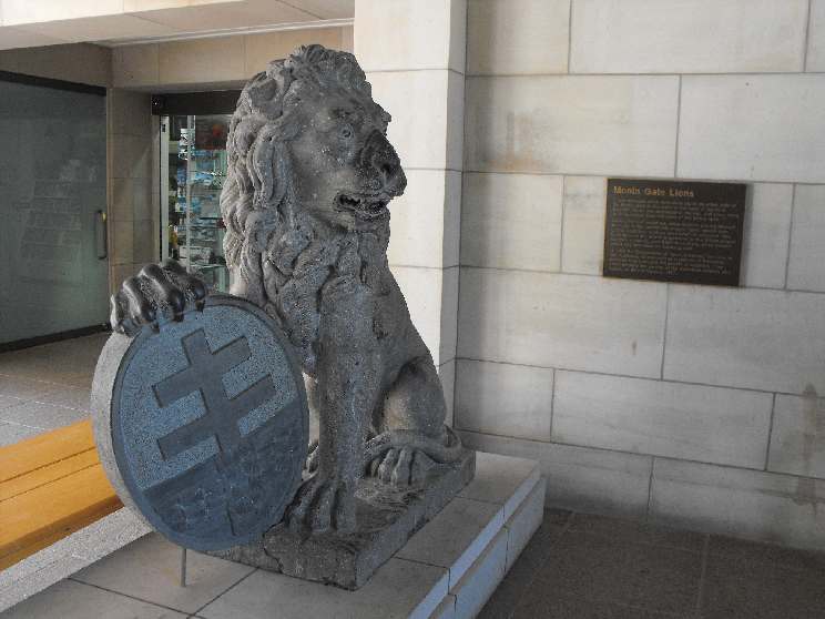 |  Two carved stone lion statues, apparently dating from medieval times, were mounted at the original Menin Gate. German shelling during the four years of conflict destroyed much of both the Gate and the besieged town of Ieper. During an Australian ambassadorial visit to Ieper in 1936, an approach was made of the town council to have these lion statues recovered and shipped to Australia for inclusion in the then newly completed Australian War Memorial in Canberra. This lead to the Mayor of Ieper gifting them to the AWM as recognition for the sacrifice made by Australian forces in the defence of Ieper during WWI.   The damaged lions were recovered from the rubble and subsequently shipped to Australia where they were held in storage for many years before restoration 1987. They were subsequently mounted at the main public entrance to the Australian War Memorial (seen above). In symbolic remembrance of the 18,000 Australian soldiers killed during the 3rd battle of Ypres, visitors to the Memorial pass between the two lions, as did the soldiers when marching off to the front. During the 2014 - 2018, as part of the centenary commemorations of WWI, the two lions are being shipped back to Ieper and the Menin Gate where they will once more stand guard before their return to the AWM. |