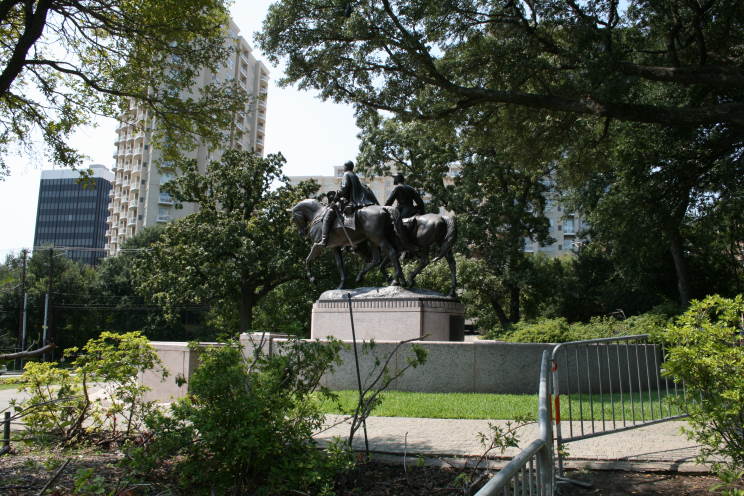 | The Robert E. Lee Monument seen on Sept. 8, 2017. Notice the barricades around the monument in advance of its removal. Also notice the lack of a large crowd (or even any crowd) either protesting or supporting the monument. |