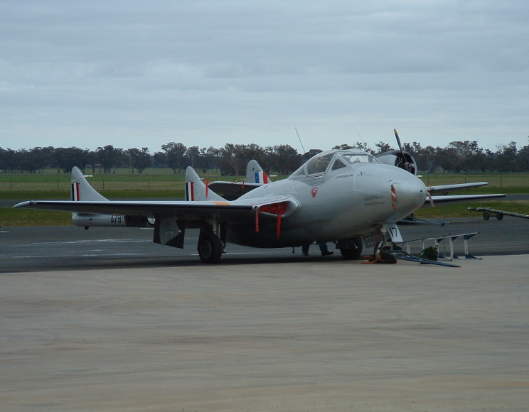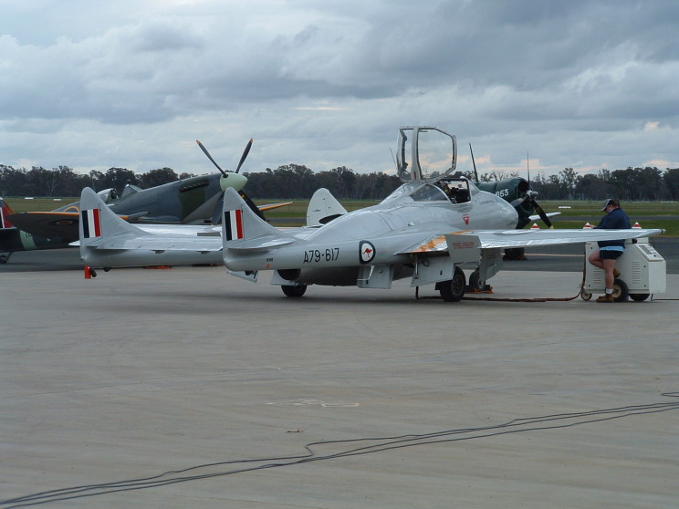 The de Havilland DH-115 Vampire on the tarmac before the flight demonstration, a Spitfire Mk XVI is seen in the background.