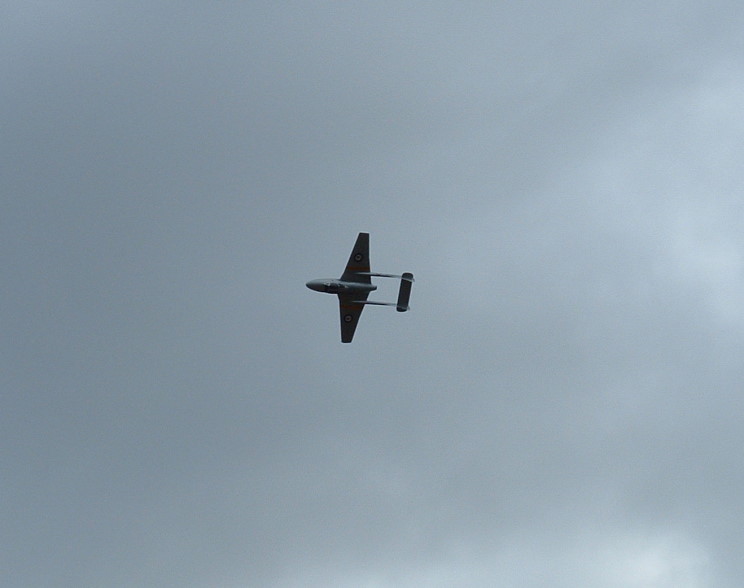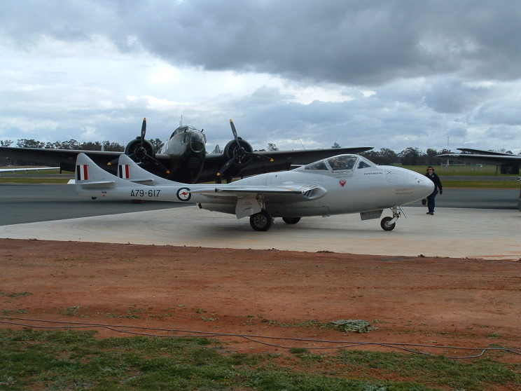 The de Havilland DH-115 Vampire after the flight demonstration, the Lockheed Hudson "The Tojo Busters" is seen in the background.