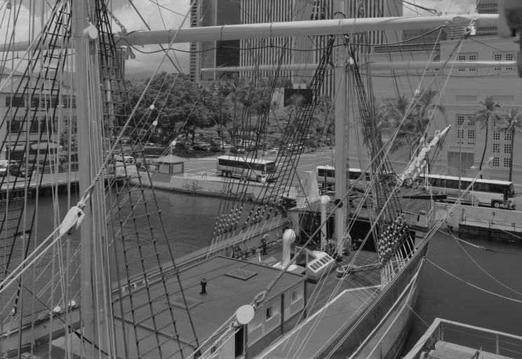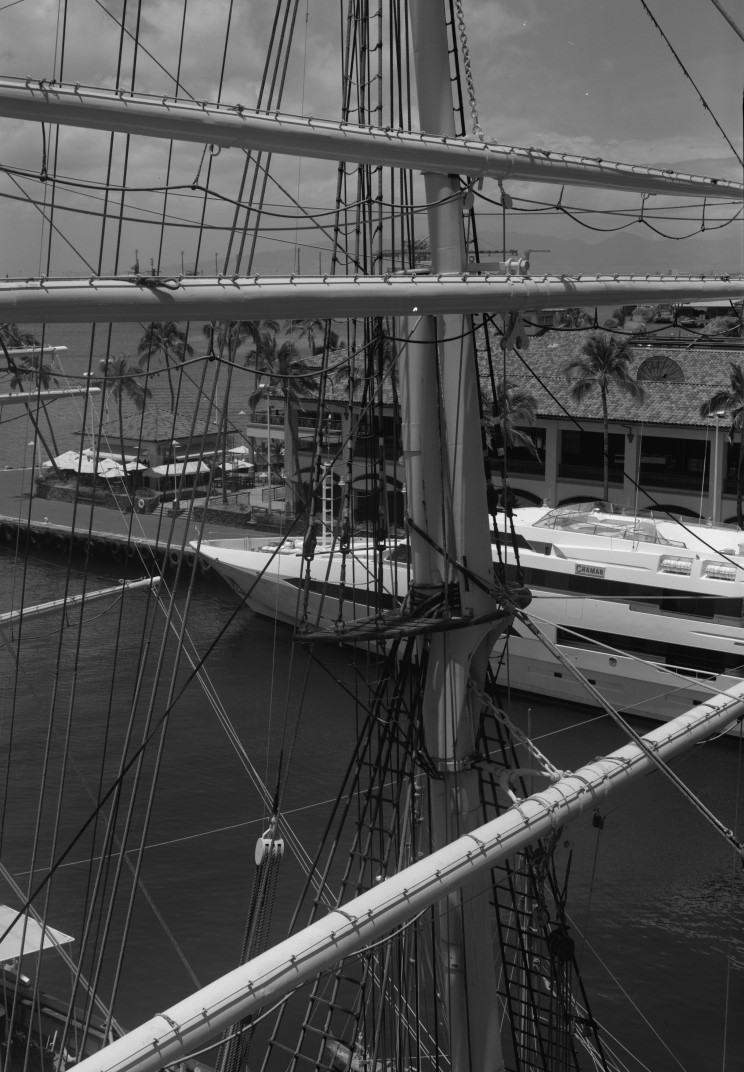 April 1998: The third mast on the Falls of Clyde, showing the impressive rigging of the ship.
