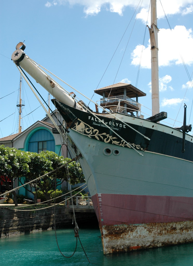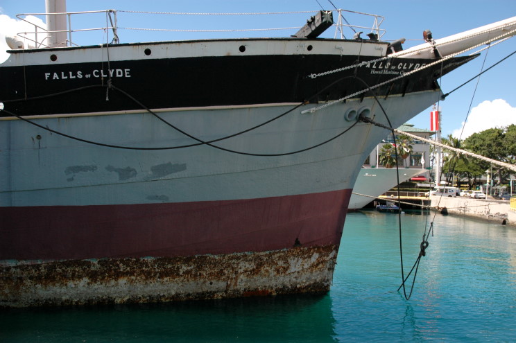 September 5, 2008: Close up of the bow of the Falls of Clyde showing the missing figurehead and hull condition. |