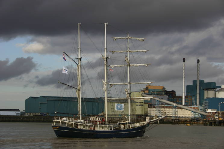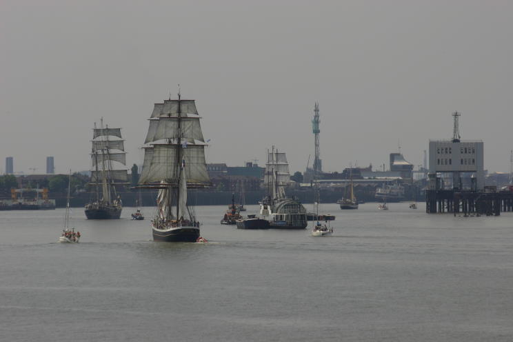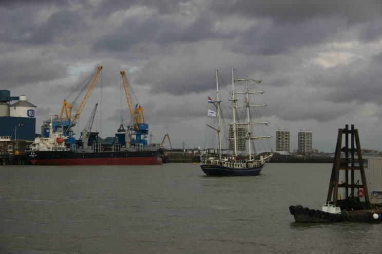 July 25, 2012: Morgenster (foreground), Thalassa (leading Morgenster) and other ships of the Dutch flotilla seen on the River Thames departing London, England after the