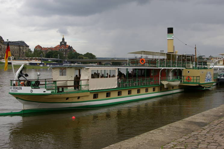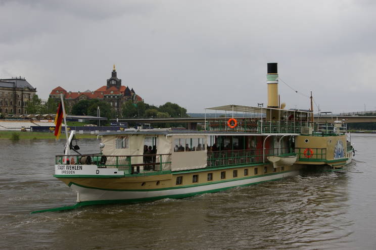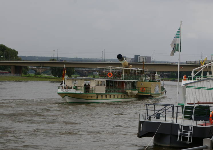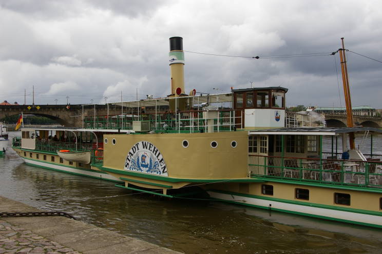 August 31, 2010: Stadt Wehlen seen on the River Elbe at Dresden, Germany. Note the retractable funnel being lowered to clear the low bridges on the Elbe. |