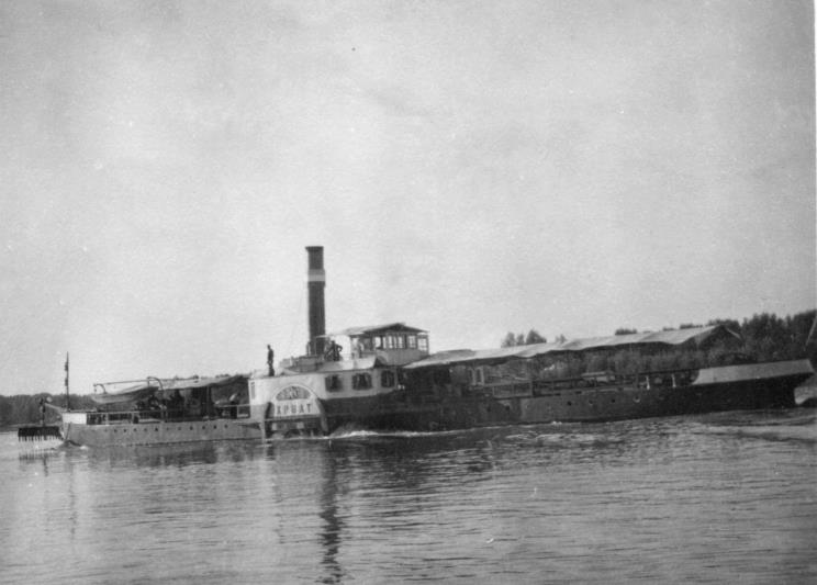 The river steamer Hrvat seen around 1932. (I have been unable to locate any information on this ship, if you can provide anything please email the webmaster.) The name written on the side of the ship (Xpbat) is in the Cyrillic script (that was often in the Kingdom of Yugoslavia 1918 - 1941) and in Latin script it reads "Hrvat" which means Croat. -Vladimir Tarnovski |