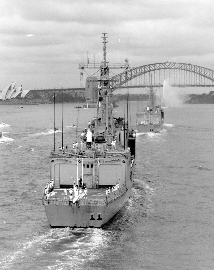 December 1990: HMAS Darwin FFG-04 and HMAS Adelaide FFG-01 (background) seen in Sydney Harbour returning from the Gulf War. |