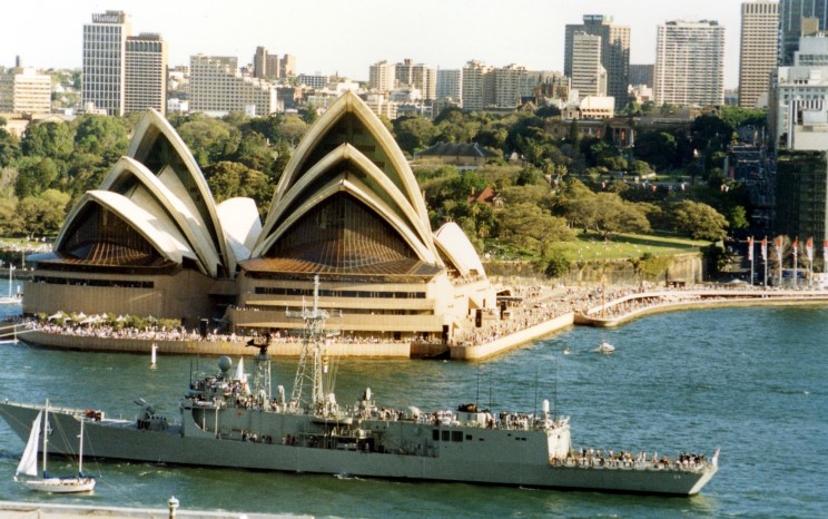 Oct. 1988: HMAS Darwin FFG-04 passing the Sydney Opera House during the RAN's Bicentennial Naval Salute. |