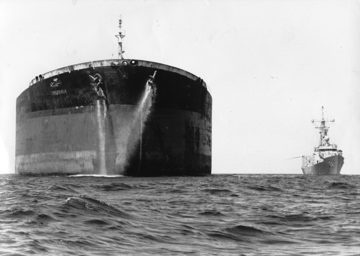 May 2, 1991: HMAS Darwin FFG-04 passing the super tanker Amuriyah. |