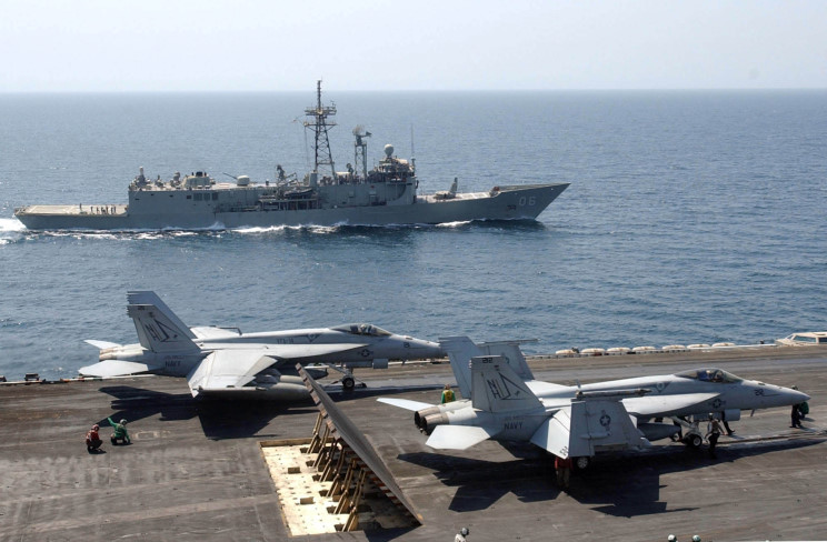 September 10, 2005: HMAS Newcastle FFG-06 alongside the USS Nimitz CVN-68 in the Persian Gulf conducting maritime security operations. |
