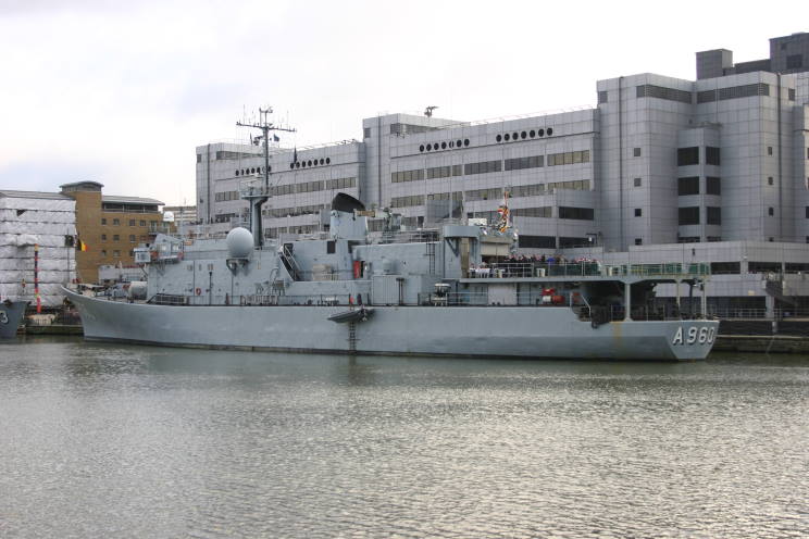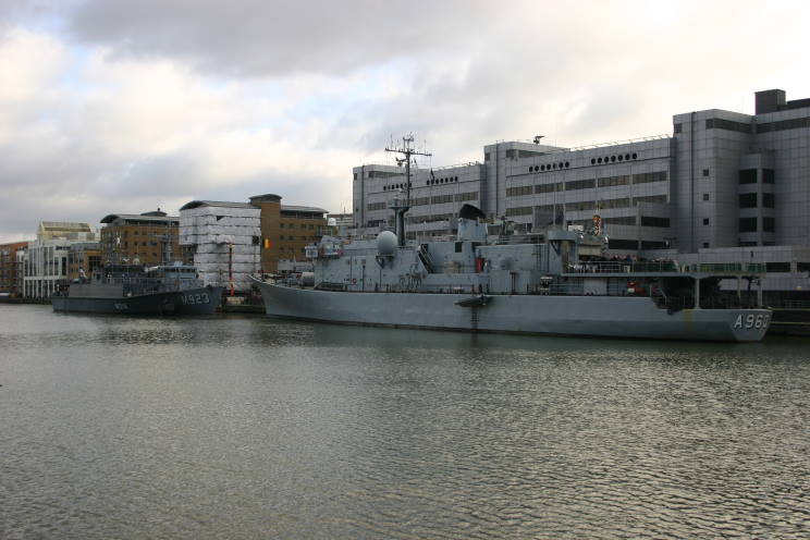 December 10, 2012: Godeita A-960, the Estonian minehunter Sakala M-314 and the Belgian minehunter Narcis M-923 seen alongside the West India Dock, London, England. |