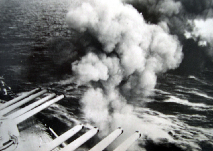 Dunkerque firing her 13"/50 (330mm) main battery during gunnery practice in 1939. |