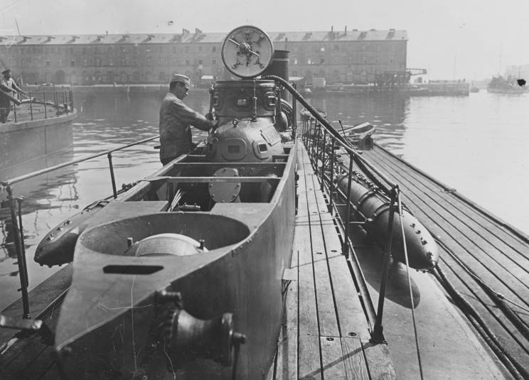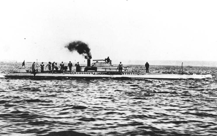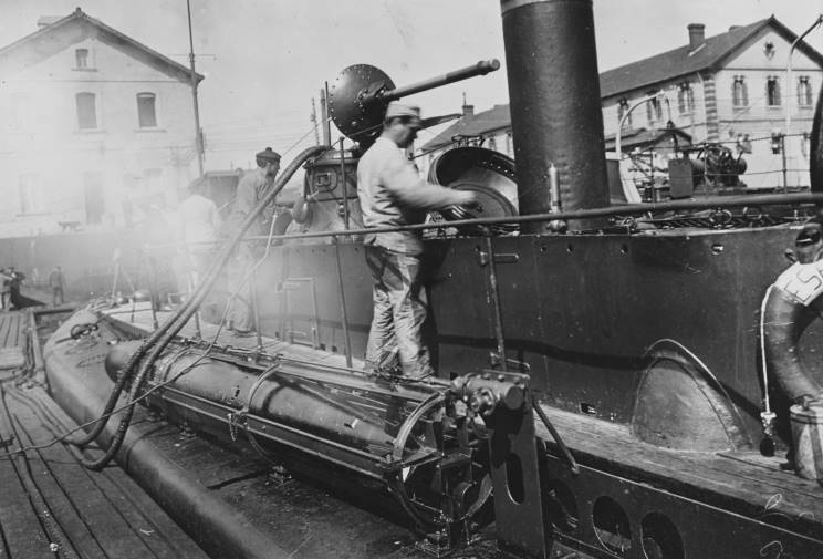 Espadon seen at Cherbourg, France. Note the 17.7" (450mm) torpedo in the Drzewiecki drop collar external launching system. |