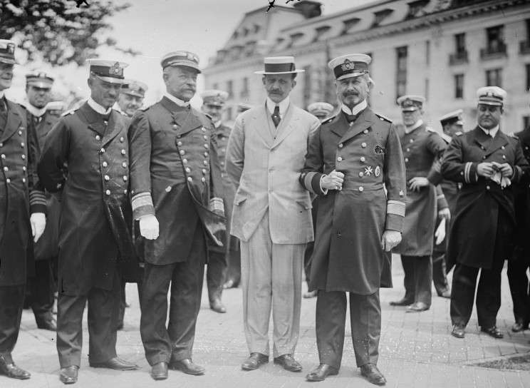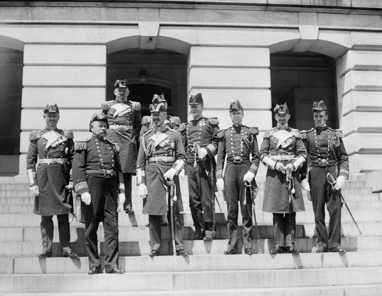 June 5, 1912: A delegation from SMS Moltke including Admiral Hubert von Reuber-Paschwitz pose with Rear Admiral Aaron Ward in front of the State, War and Navy building in Washington, D.C. |