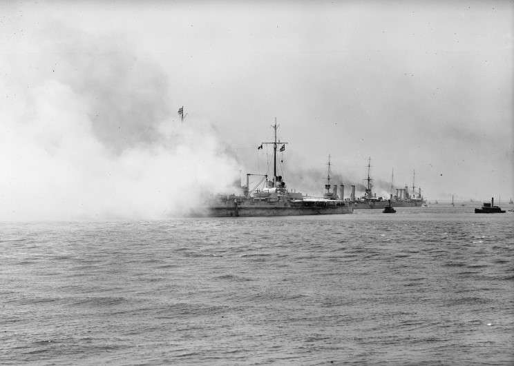 June 8, 1912: SMS Moltke fires a salute as the German ships depart Hampton Roads for New York. SMS Stettin and SMS Bremen are seen astern of Moltke. |