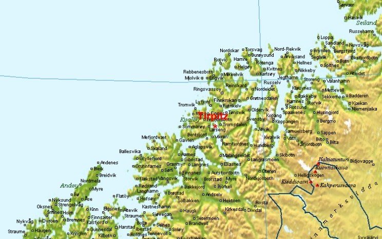 Location of the wreck of Tirpitz (68.39N - 18.49E).