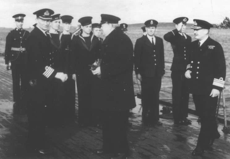 October 18, 1942: Captain Sir Charles H. L. Woodhouse, R.N. receives Prime Minister Sir Winston S. Churchill on board the HMS Howe. An unidentified Vice-Admiral follows Mr. Churchill. Warrant Bosun Thomas Noel Mayfield is seen saluting in the background. |