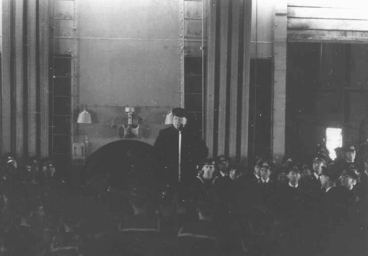 October 18, 1942: Prime Minister Sir Winston S. Churchill addresses the crew on board the HMS Howe. |