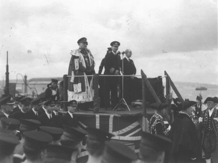 August 29, 1942: Captain Sir Charles H. L. Woodhouse, R.N. (later Admiral Sir Charles H. L. Woodhouse, K.C.B.) and Sir William Young Darling, Lord Provost of Edinburgh speaking at the commissioning ceremony for the HMS Howe at Rosyth, Scotland. |