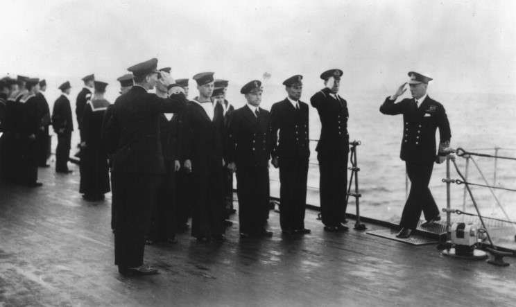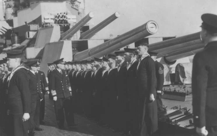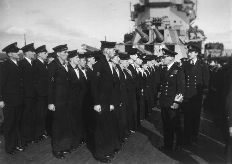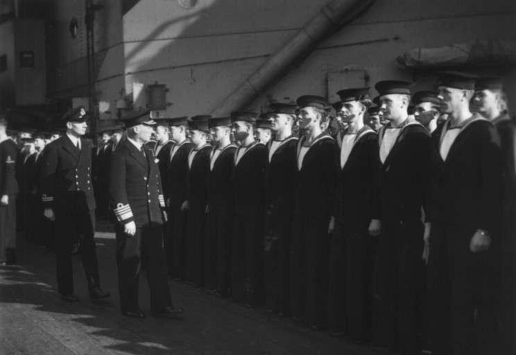 Admiral Sir John C. Tovey, G.C.B., K.B.E., D.S.O., D.C.L., C-in-C Home Fleet inspecting the crew of the HMS Howe in late 1942 or early 1943. |