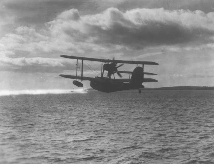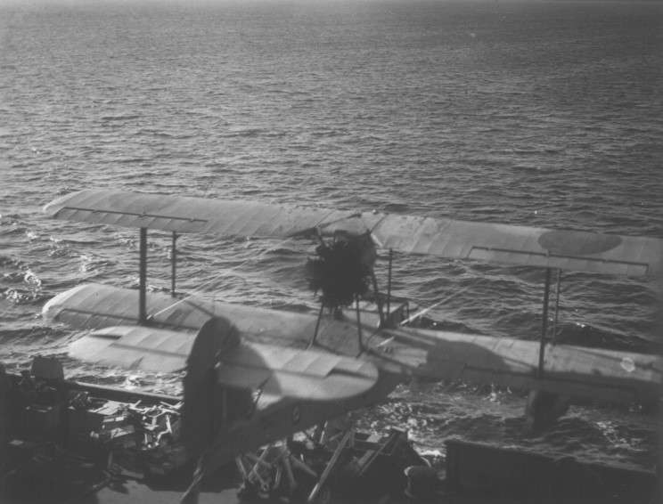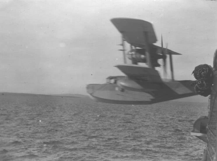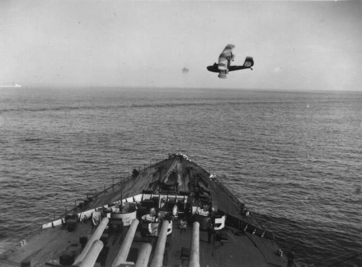 The Walrus floatplane in flight off the bow of the HMS Howe. |