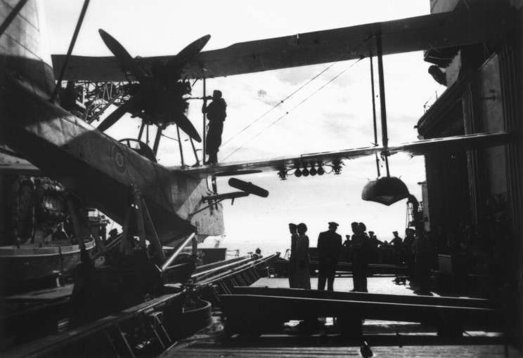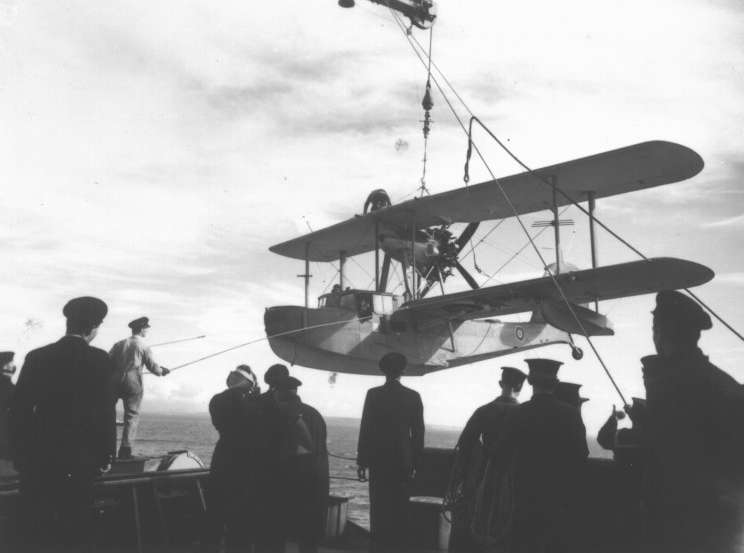 A Supermarine Walrus floatplane is loaded aboard the HMS Howe in Sept. 1942. |