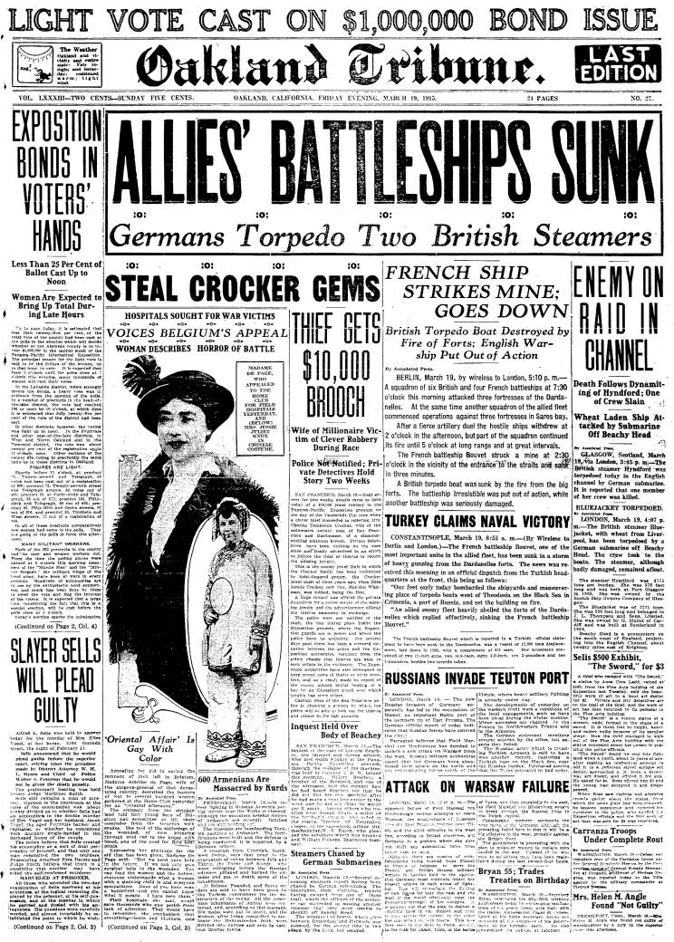 March 19, 1915: Front Page of the Oakland Tribune, Oakland, California. |