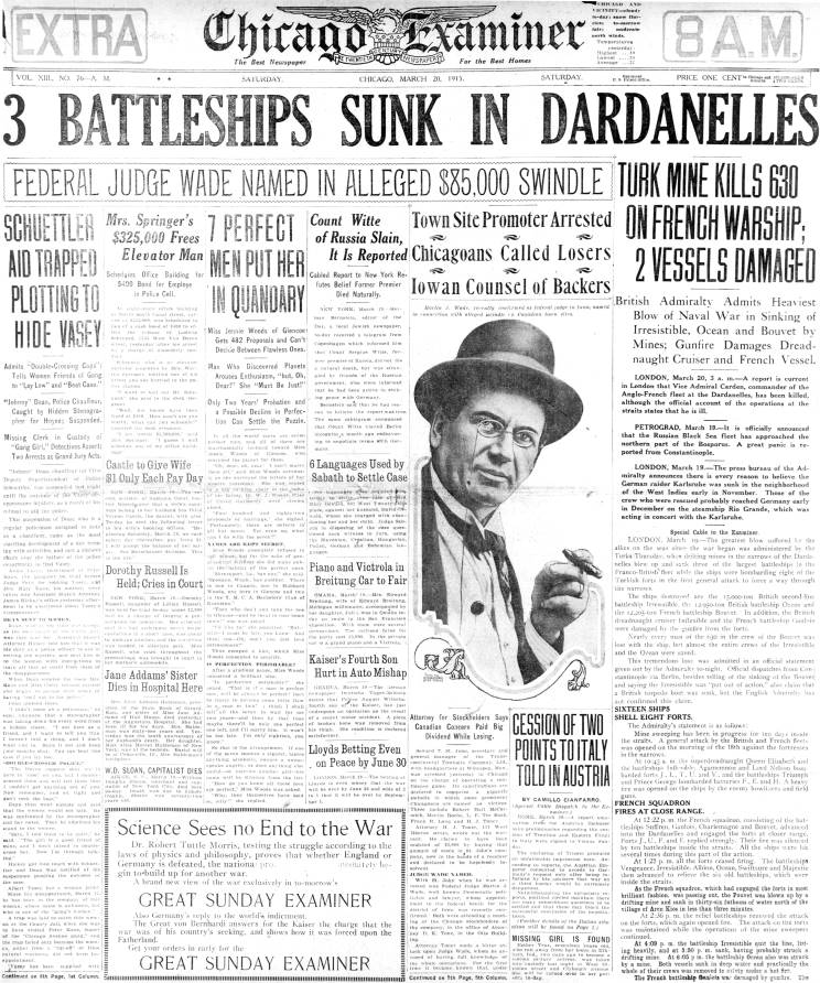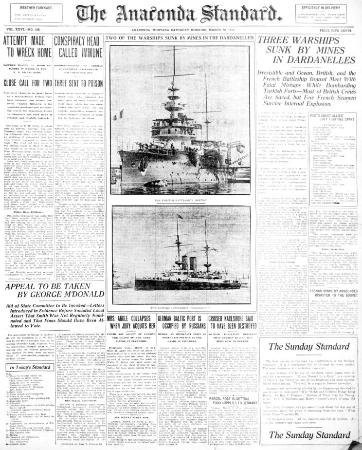 March 20, 1915: Front page of The Anaconda Standard, Anaconda, Montana showing photos of both HMS Irresistible and Bouvet. |