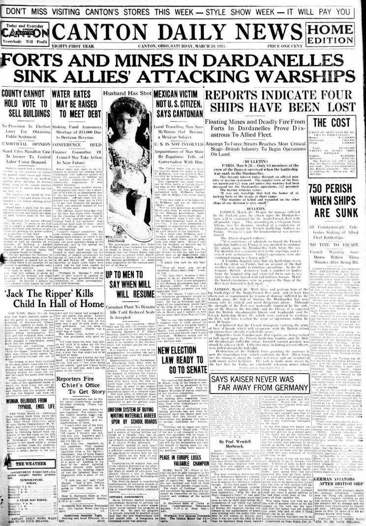 March 20, 1915: Front page of the Canton Daily News, Canton, Ohio. |