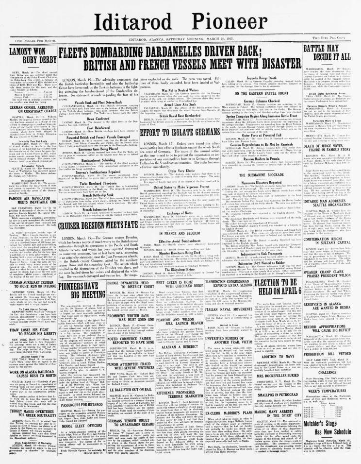 March 20, 1915: Front page of the Iditarod Pioneer, Iditarod, Alaska. |