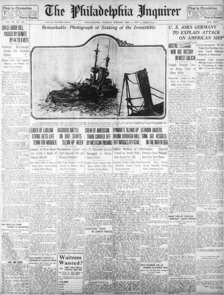 May 4, 1915: Front page of The Philadelphia Inquirer showing the released photo of HMS Irresistible sinking. Many papers in the United States published this photo. |