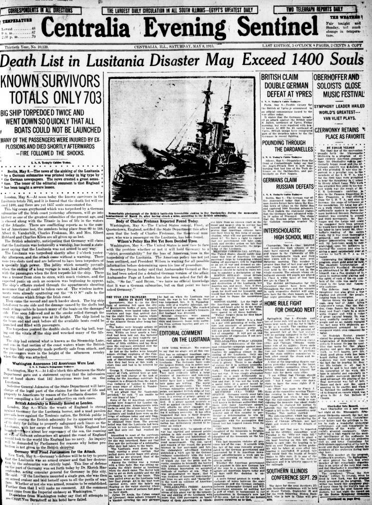 May 8, 1915: Front page of the Centralia Evening Sentinel, Centralia, Illinois. This page is interesting because the editor has used the photo of HMS Irresistible on the front page rather than one of the Lusitania, which was sunk by SMS U-20 the day before. |