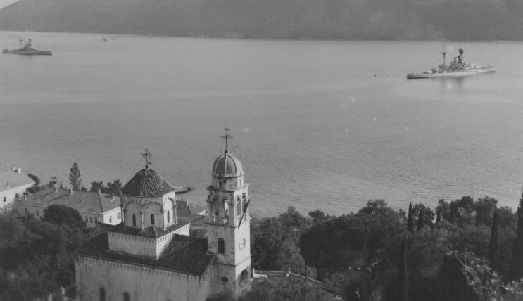 August 1933: HMS Revenge (right) and an unidentified Royal Sovereign class battleship seen at Kotor, Yugoslavia (Montenegro). |