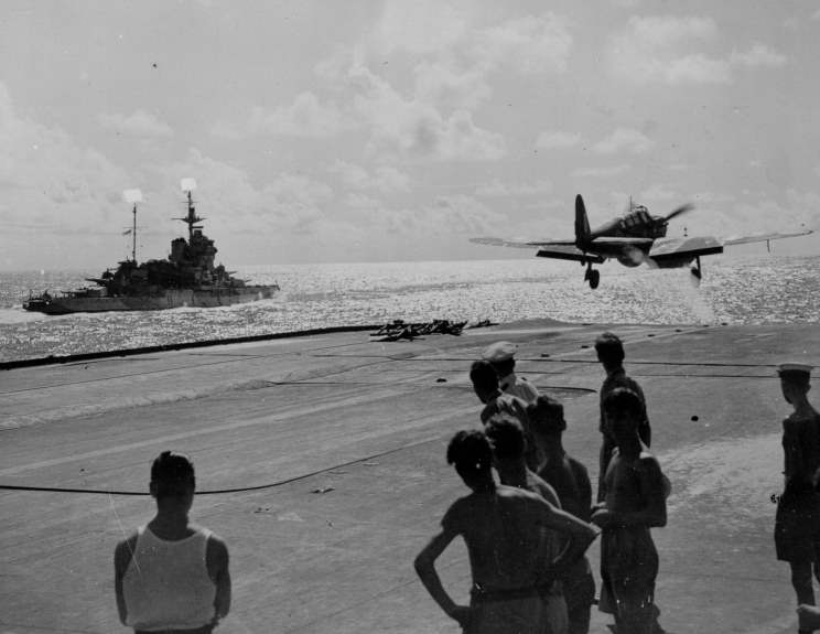 A Fairey Fulmar taking off of HMS Venerable, HMS Revenge is seen in the background. Note that sensor has deleted mast head radar aerials on Revenge. |