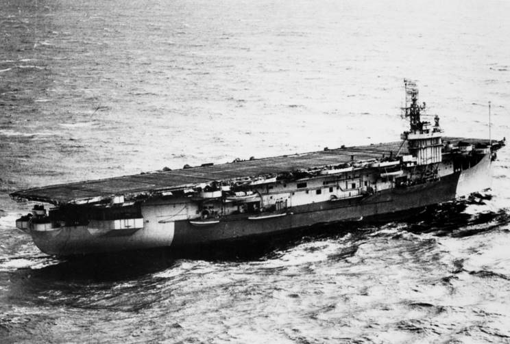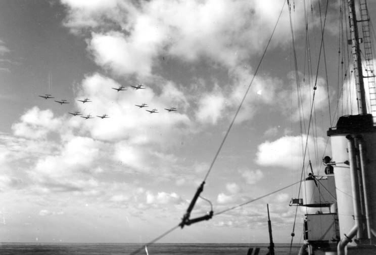 Grumman Avengers thought to be from 853 Squadron seen in the air above HMS Arbiter. |