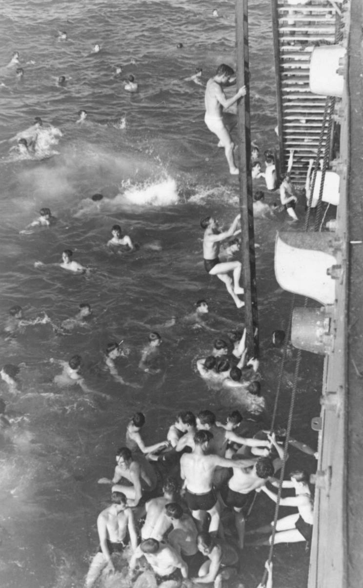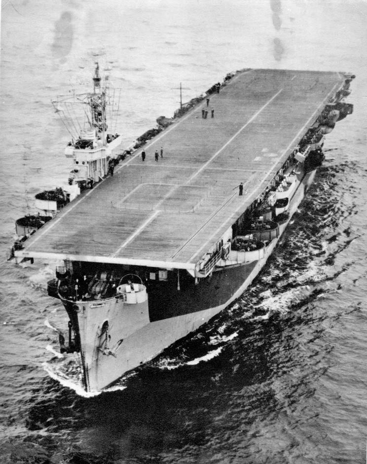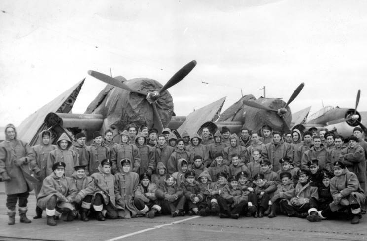 Men thought to be 853 Squadron seen on the flight deck of HMS Arbiter. Three Grumman Avengers are seen in the background. |
