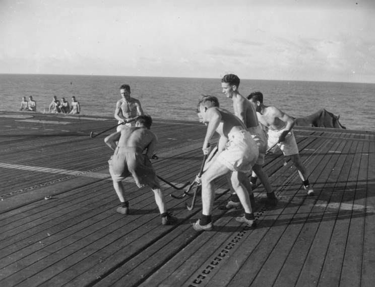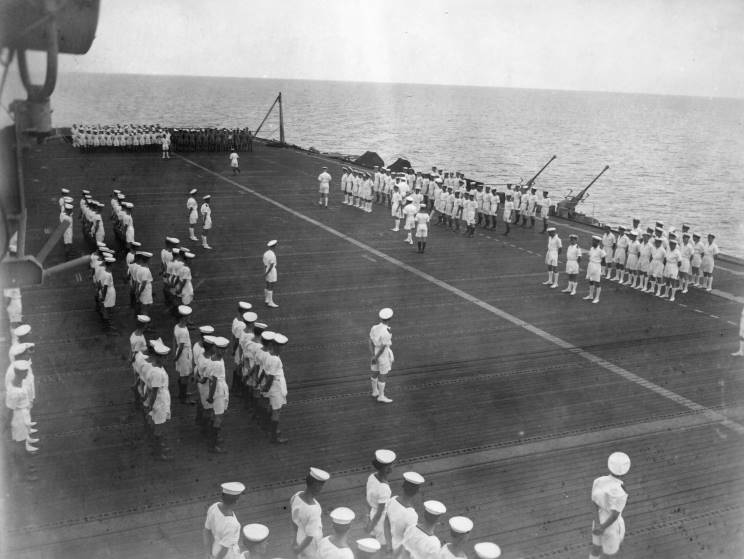 Sunday divisions on the flight deck of HMS Arbiter. |