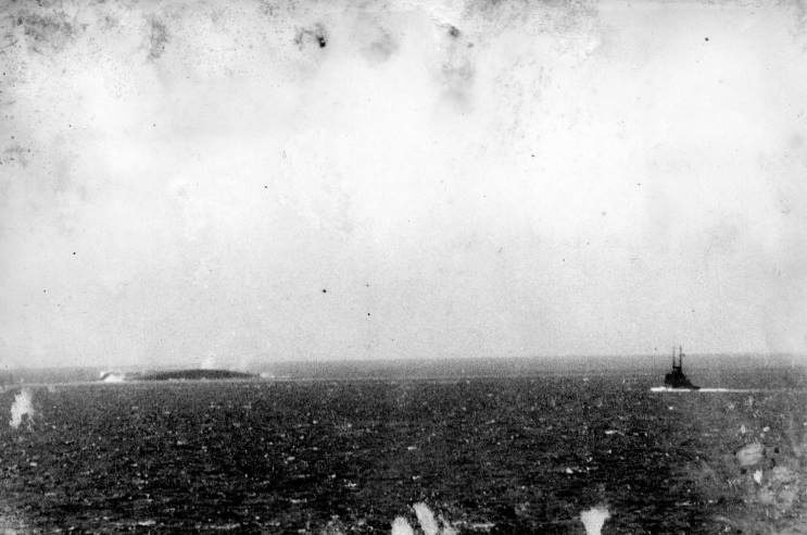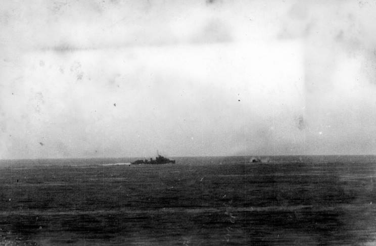 August 11, 1942: HMS Eagle seen burning after being hit by torpedos from U-73. |