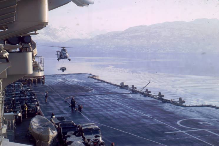 1974: A Royal Navy Westland Wessex 5 helicopter preparing to land off from HMS Hermes R-12 at Namsos, Norway. |