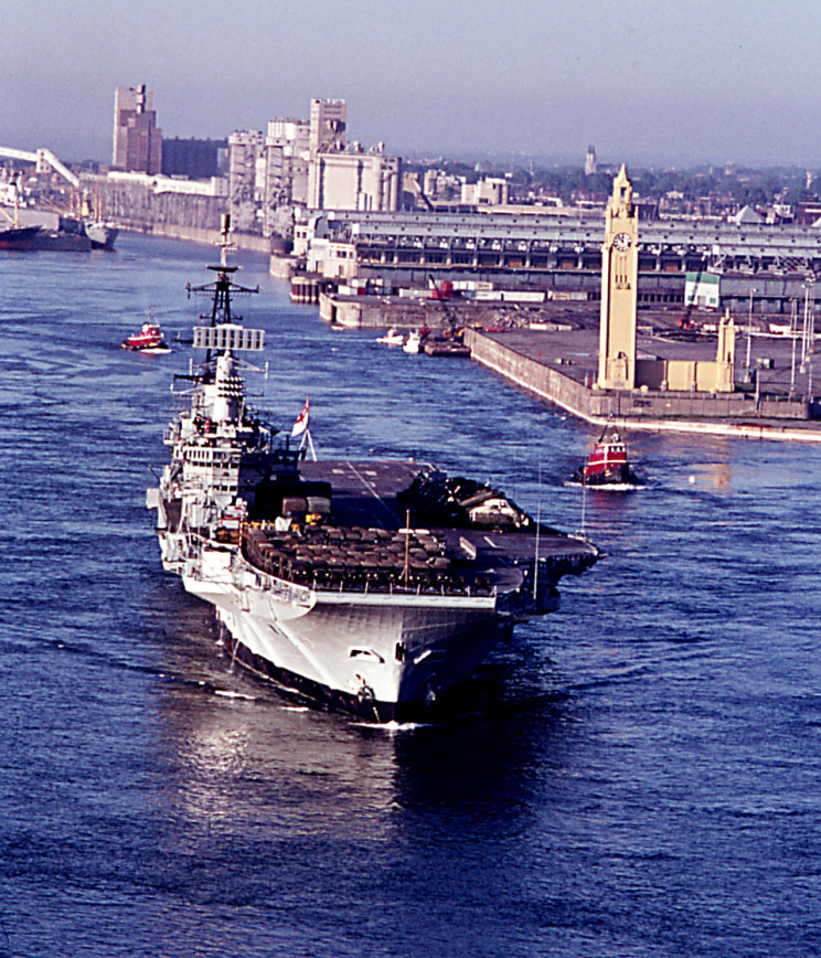 HMS Hermes R-12 with HRH Prince Charles embarked seen at Montreal, Canada in 1975. |